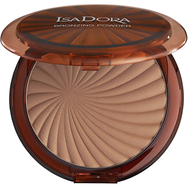IsaDora Bronzing Powder är ett rikt pigmenterat stort solpuder för en fräsch, solkysst look med semi-transparent effekt. Appliceras på ansikte, axlar och dekolletage. För alla hudtyper. Oparfymerat. Kliniskt testat.