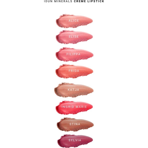 IDUN Minerals Creme Lipstick är ett läppstift som ger en fin glans och är ett fuktgivande läppstift. Läppstiften innehåller sheasmör och nordisk hjortronolja som vårdar och gör läpparna mjuka samt vitamin E, en antioxidant som har en skyddande effekt. Konsistensen är krämig vilket ger en härlig känsla vid applicering.