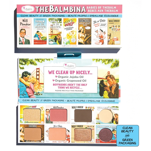 Paletten innehåller:Let´s Bolt - Highlighter/ShadowBronzilla - Bronzer, Contour & ShadowWill Powder - Shadow/BlushIt´s a Date - Shadow/BlushMale Order - Shadow/LinerMale Order - ÖgonskuggatheBalm & The Beautiful FOG - ÖgonskuggatheBalm & The Beautiful Green Screen - Ögonskugga