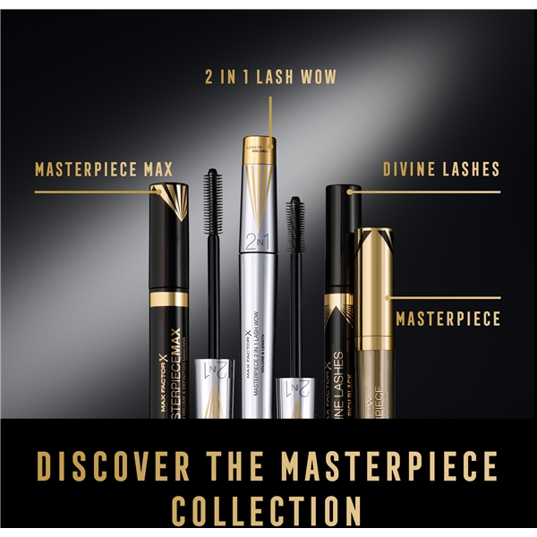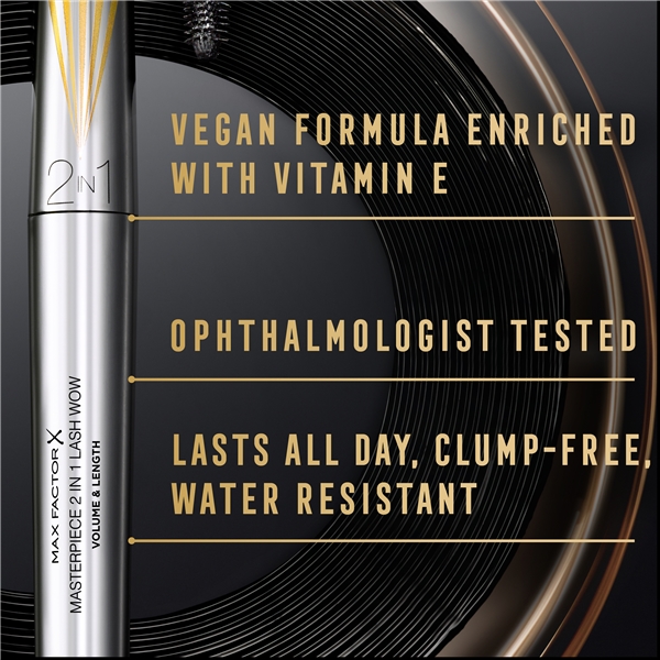 Denna veganska produkt innehåller hälsosamma ingredienser som vårdar fransarna. - Masterpiece 2 In 1 Lash Wow Mascara varken smular eller klumpar sig, utan sitter kvar där den ska från morgon till kväll. Mascaran ger både längd och volym och sitter kvar där den ska. Den är enkel att applicera, täcker fransarna från rot till topp och fångar även upp de små fransarna längst in i ögonvrån.
