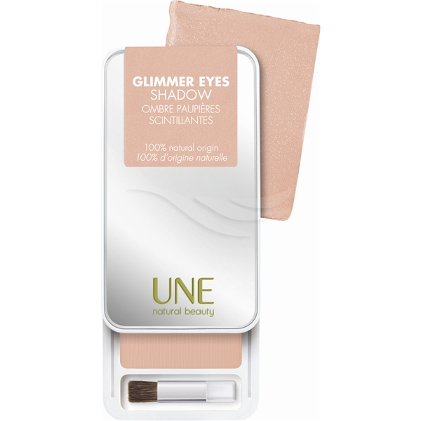 UNE Glimmer Eyes Shadow är en cremig och skimrande ögonskugga som ger ögonen en subtil slöja av glimmer. Den har en cremig textur som lätt smälter in i huden. Den glimrande effekten kommer tack vare mineralen Mica som reflekterar ljuset och ger ett vackert skimmer. Mica ger också en mjuk, cremig och fjäderlätt textur. Innehåller ekologiskt sheasmör, en antioxidant som återfuktar, skyddar, reparerar och ger näring och ekologiskt bivax som är mjukgörande och reparerande. Hypoallergen formula. Dermatologiskt och oftalmologiskt testad.