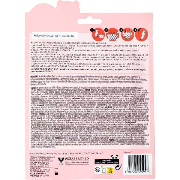 Oh K! Watermelon Jelly Foot Peel är en exfolierande fotmask som innehåller fruktsyror (AHAs & BHAs) som varsamt exfolierar huden och tar bort döda hudceller.