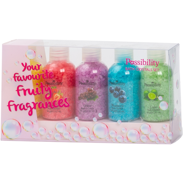 Possibility Fruity Fragrances Bath Crystals Set är ett set med badsalt som doftar som ljuvliga desserter. Eller vad sägs om doft av grapefrukt, jordgubb, vindruva, blåbär och lime. Varje flaska innehåller 70ml.