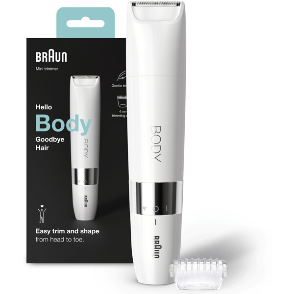 Braun Body Mini Trimmer BS1000, elektrisk hårborttagningHårborttagning med precision för bikini, armhålor och bröst. Snabb och enkel, wet & dry, med trimmerkam, perfekt när du är på språng. En funktionell kroppshårstrimmer i mini-format för alla som ger snabba, enkla och skonsamma resultat – även i känsliga områden. Brauns Mini-trimmer klipper med precision, vilket ger dig nära kontroll över hårets längd. Snabb och skonsam kroppshårstrimning: var som helst, när som helst.Förpackningen innehåller: 1 st Mini-trimmer1 st Trimmerkam1 st Rengöringsborste1 st AA-batteriSnabbt & enkelt: mini-storlek för att lätt kunna tas med – effektiv hårborttagningSkonsam & kompakt: utformad för effektiv och skonsam kroppshårstrimning för allaWet & dry: 100 % vattentät, så att du kan använda den som du villExakt: Tysk skärteknik för exakt trimning och formning av kroppsbehåringFlera användningsområden: går att använda för hårborttagning, trimning och för att forma håret på olika områden på kroppen