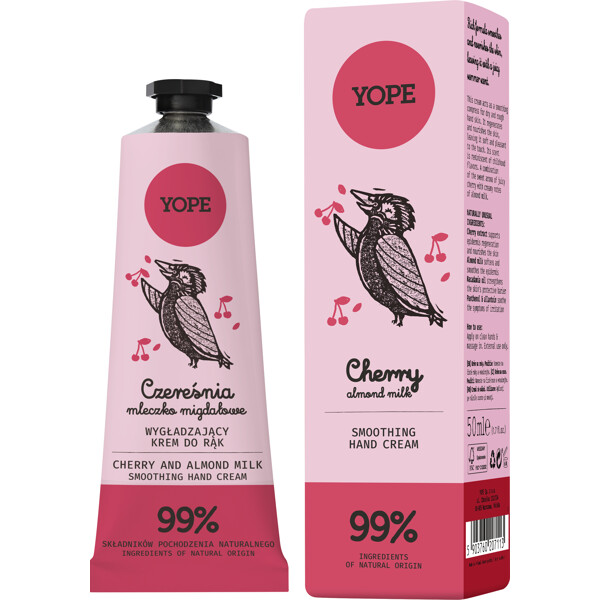 YOPE Cherry and Almond Milk Hand Cream är en vårdande njutning i en liten tub. Dess delikata doft väcker barndomens smaker och kombinerar sötman från mogna körsbär med sammetslena mandeltoner.