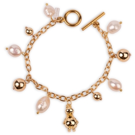 Ett 18K guldpläterat vuxenarmband med hängande guldpläterade kulor i olika storlekar och vita äkta sötvattenspärlor.