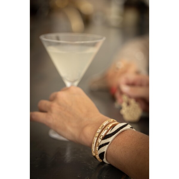 En 18K guldpläterat hårt armband med handinfattade Cubic Zirconia stenar som reflekterar ljuset fantastiskt. Stenarna är klara, guldbruna och svarta och bildar ett leopardmönster.