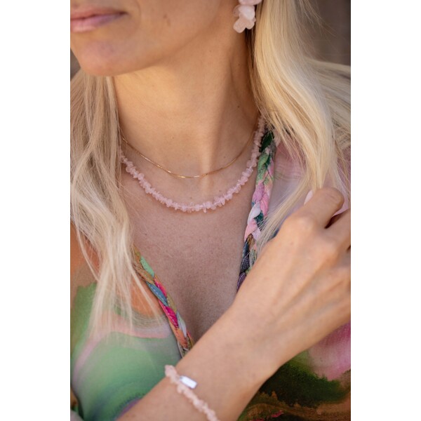 Ett coolt halsband med rosa små rosenkvartsstenar.