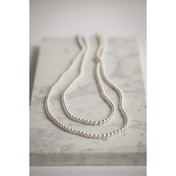Ett snyggt, trendigt och vackert halsband med vita lite mindre skalpärlor/Mother of Pearls. Halsbandet är långt – 110 cm och du kan ha det två varv runt halsen om du inte vill bära det som det är. Halsbandet har ingen knäppning/öppning.