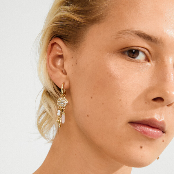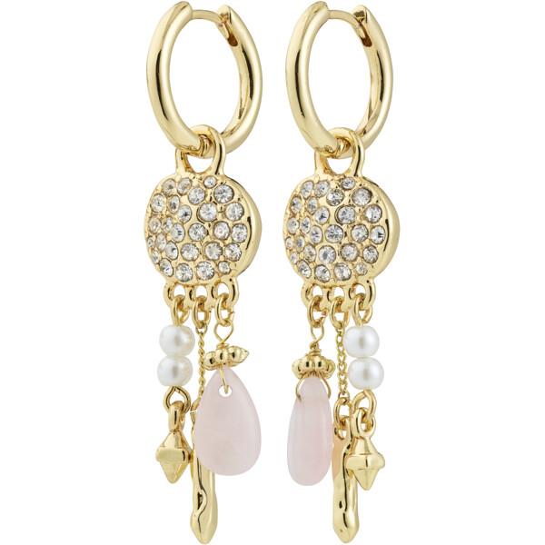 De guldpläterade SHIFT-hoopsen från Pilgrims Moments of Change-kollektion är den ultimata kombinationen av boho chic och lekfull elegans. Små mynthängen, prydda med gnistrande Preciosa-kristaller, reflekterar ljuset på ett magiskt sätt medan glaspärlor i pärlemorfärg och kärleksstenen rosenkvarts ger en lätt och fri känsla. En lekfull kombination av detaljer som ger din look en drömmig och unik energi.