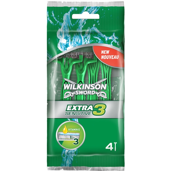 Extra 3 Sensitive - Disposable Razor från Wilkinson Sword har 3 flexibla blad av hög kvalitet på ett rörligt huvud, för en nära och behaglig rakning. 2 mjukgörande remsor med vitamin E som mjukgör och gör att rakhyveln rör sig smidigt. Lättviktshandtag designat för män, format för bästa komfort och kontroll. Praktiskt skydd för att hålla ditt rakblad säkert och rent när du är på språng.