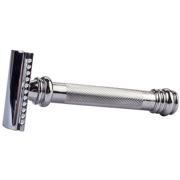 Safety Razor 38C är en dubbelsidig säkerhetshyvel som är 2 cm längre än Safety Razor 34C. Det är för att vissa föredrar ett längre handtag när det ska raka sig.Med hjälp av en säkerhetshyvel från Merkur får du en finare rakning än vad du skulle få med ett vanligt flerbladssystem. Bladen är också mycket billigare och blir ett ekonomiskt plus i längden.Safety Razor 38C är tillverkad i stål med en räfflad handtagsyta för ett stadigt grepp under hela rakningen.När du köper Safety Razor 38C från Merkur ingår det ett Merkur Double Edge Razor Blade.Vikt: 110 gramLängd: 103 mmBredd: 41 mmHandtag diameter: 15 mm