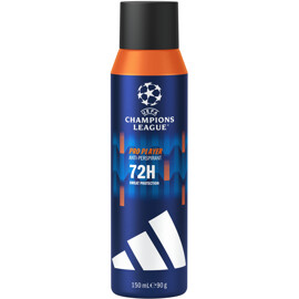 Håll dig fräsch längre – oavsett spelplan. Adidas UEFA Champions League Pro Player Anti-Perspirant 72H Dry Protection är en deodorant som ger upp till 72 timmars skydd mot svett och lukt, med en aromatisk doft som kombinerar fräsch lavendel, jordig patchouli och varma tränoter.