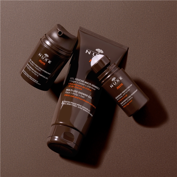 NUXE MEN Multi Use Shower Gel är en duschgelé med extrakt från ek och avenbok som rengör ansikte, kropp och hår skonsamt. Efterlämnar huden återfuktad.
