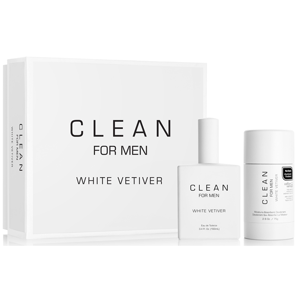 Clean for Men White Vetiver har en sensuell, rökig ton med toner från vetiver, bergamott och mysk. I setet ingår: