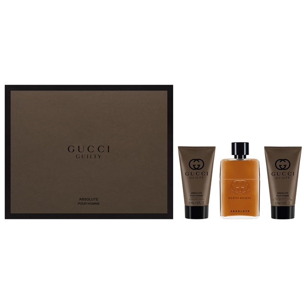 Gucci Guilty Absolute är en innovativ, manliga trädoft som fångar essensen hos de frigjorda män den är skapad för - perfekt för Gucci-mannen. Lädernoterna är en hyllning till det ultimata Gucci-materialet, medan flaskan har hämtat inspiration från eleganta herrsalonger, med strukturer och färger som andas konjak och cigarr. Den sticker ut i kategorin klassiskt manliga trädofter genom att bryta mönstret för hur dessa dofter traditionellt sett är uppbyggda. I setet ingår: